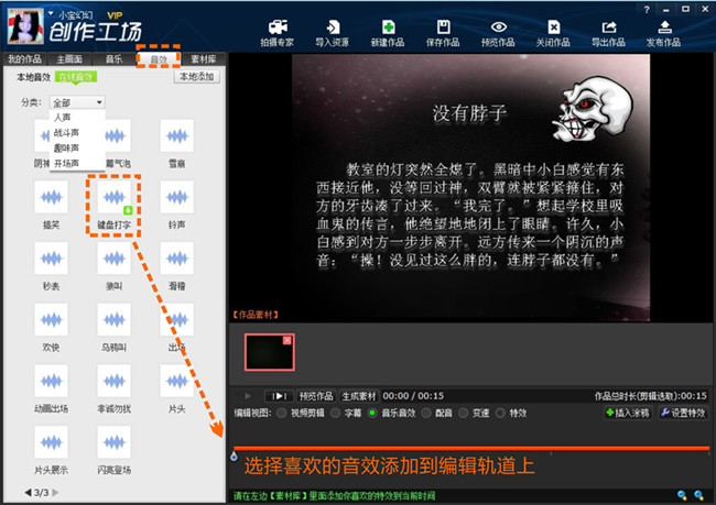 第1步:如下图1,打开拍大师,进入【创作工场】界面,点击【音效】的【在线音效】,在【分类】一栏将看到人声、战斗声、趣味声、开场声等几个音效分类。选择喜欢的音效拖动到右下方的编辑轨道上,音效在添加到编辑轨道的过程中也会自动完成下载。
