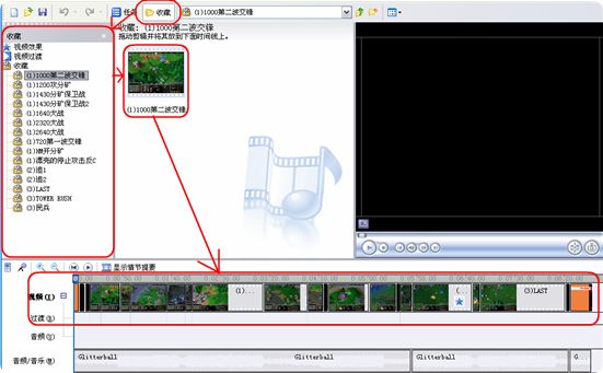 注:这里预览素材或者预览过度和视频特效.