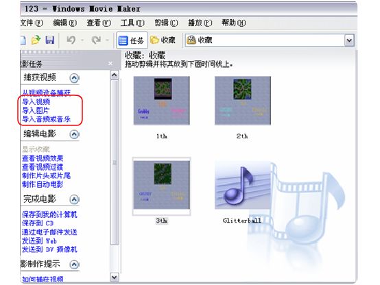 相关的图片,音乐,录象视频等素材(或者就只有录象视频)都准备好了,我们来把它们导入到WMM中.(在导入素材前最好把素材分类并给予恰当的命名)