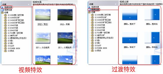 选择自己喜欢的特效,记住视频特效直接拖拽到视频或图片上面,而过渡特效则拖拽到两个素材之间.