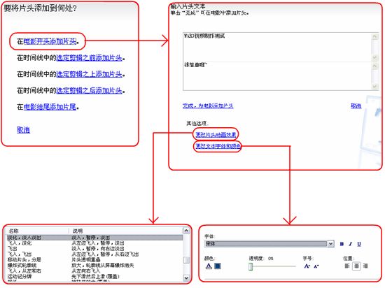 步骤二:进入后选择”电影开头添加片头”,然后输入片头文本这里有两个选项:”更改片头动画效果”和”更改文本字体和颜色”,可以选择自己喜欢的动画效果和字体,颜色.具体操作如图: