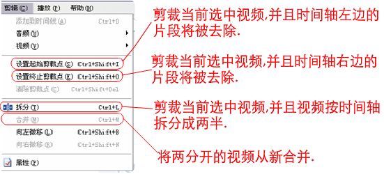 确定要剪辑的地方后,在菜单栏选择”剪辑”,下面是对一些重要的子菜单的说明下.
