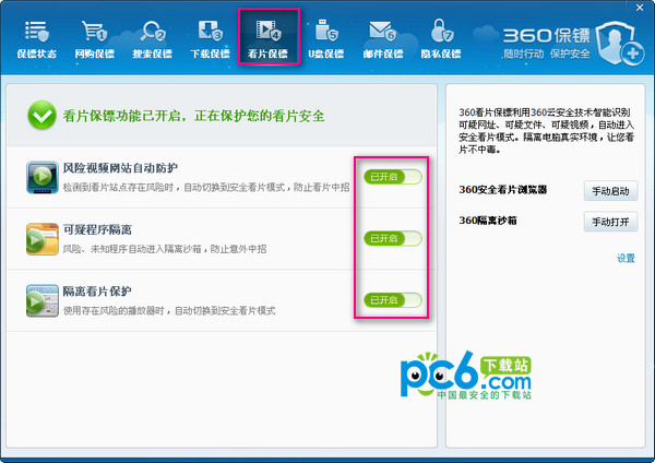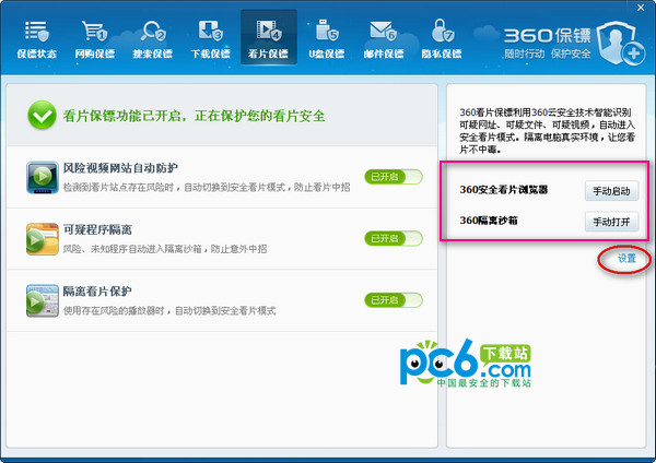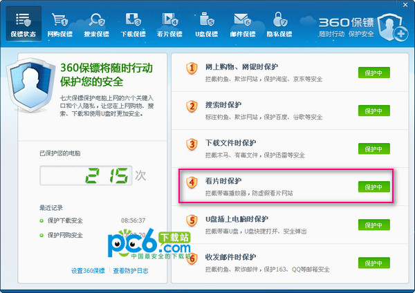 3.打开360保镖的设置界面,在右侧的第四个就是看片时保护,绿色按钮显示保护中,我们点击这个按钮级可以切换到看片保护的子界面。
