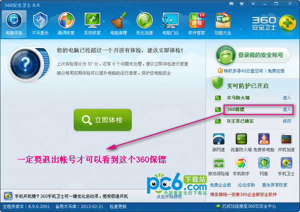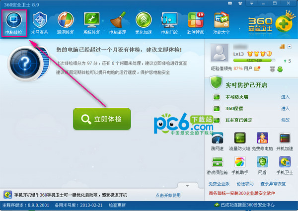 1.360看片保镖是360保镖的功能,这个功能不好找。先打开360的主界面,切换到电脑体检选项下。