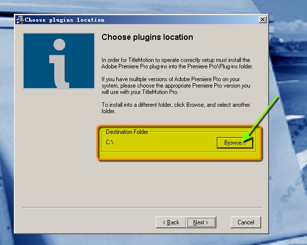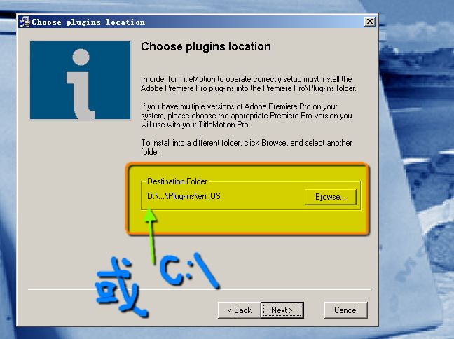 1、安装TitleMotion Pro for Premiere Pro时,在第一次出现安装路径“C:\”的对话框中,