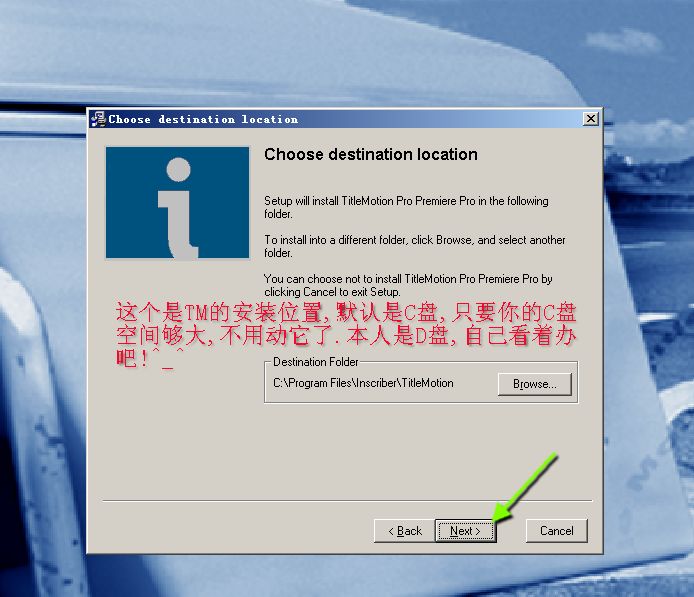点击“下一步”后,出现的汉化路径请一定选择在x:\Program Files\Inscriber\TitleMotion,