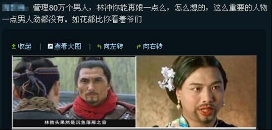 “林娘子”本是剧中对林冲妻子的称呼,可网友却在微博中写道,演员胡东本是俊朗硬汉,在新水浒中却表现的柔弱幽怨,身为80万禁军教头,英雄气场全无,处处像个怨妇,比她夫人更适合“林娘子”这个称呼。剧中奸臣童贯戏称林冲是“沉鱼落雁,闭月羞花”之时,网友更是流汗不已。关于的林冲的“娘气”,还有网友在微博调侃,新版林冲外貌粗犷却娘气十足更像是周星驰电影中那个回眸一笑的“如花姑娘”。