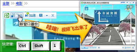 方法二: 当鼠标鼠标移动到视频上时,通过快捷键直接可以直接到达“飞出”效果,默认快捷键设置为: Ctrl+Shift+1 ; 您也可以在设置项中自由定义