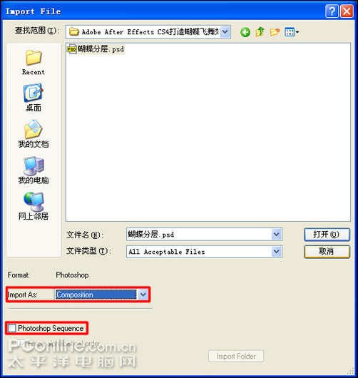 一、打开Adobe After Effects CS4软件,鼠标左键双击项目窗口空白处,弹出导入素材对话框选择素材“蝴蝶分层”,在导入素材对话框中,在“Import As”选项中选择“Composition”,不勾选“Photoshop Sequence”选项,如图1所示。