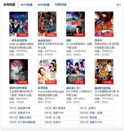 再接着往下,我们就能看到更多过往经典热播剧的回顾,包括近期热播、2010热播、2009热播、经典回顾四大标签,每个标签下都包含了众多剧集,所收录的电视剧几乎都是当年或现在国产电视剧中的焦点(图4)。