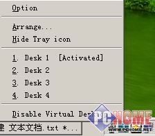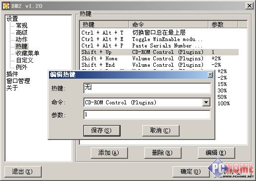 三、小插件更实用 DM2中还提供了丰富的插件,使其功能大大增强,软件默认安装了光驱控制、音量控制等六个小巧实用的插件程序。 1.光驱玩特技——热键开关 在设置对话框单击“插件”标签,选中“CDControl”插件单击“设置”按钮,选中“Enable”选项即可启用光驱控制插件,“Auto close cd door at”下拉框中可以设置自动关闭光驱仓门的延迟时间;随后单击“热键”标签,DM2已经添加好了控制光驱开关的热键“Shift+Up”,如果觉得这个热键不方便,可以双击打开设置对话框,将光标定位在“热键”栏,按下新热键即可(如图3),例如笔者将其修改为“Ctrl+1”,这样单手即可完成控制。下面的“参数”栏默认为“1”,表示控制第一个光驱,输入“2”就可以控制第二个光驱。另外,这里要提示的是,光驱热键是一个双向开关,按一次是打开,再按一次就是关闭了。 如图3 八哥网(http://www.it8g.com)提醒大家在“热键”选项卡中还可以对Volume Control(系统音量控制)、Paste Serials Number(粘贴序列号)、Toggle WinEnable module(让禁用的菜单或按钮可用,功能类似于灰色按钮克星)三个插件的热键进行设置,这里不再详细介绍。关于这些插件的参数帮助,可以打开DM2目录下的“plugins”子目录,查看其中的TXT文件。 2.桌面玩特技——虚拟桌面 和DM2同时显示在系统托盘中的还有一个显示为“1”的图标,这是虚拟桌面插件,双击这个图标即可虚拟出一个干净的桌面。右键单击这个图标,则可以通过Desk 1、Desk 2……命令在四个虚拟桌面之间快速切换(如图4)。选择“Disable Vitrul Desktop”可以关闭虚拟桌面功能。在“插件”选项卡中打开“VitrulDesktop”的设置窗口,可以选择“Enable Vitrul Desktop”重新启用该插件并设置允许虚拟的桌面数量。 如图4小插件的使用方法