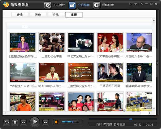 你只要打开酷我音乐盒,在“今日推荐”窗口点击“视频”选项即可看到来自优酷网上的最新热门视频,点击视频名称即可直接在酷我音乐盒中播放视频画面,控制视频播放等,而无须再打开任何窗口,这样在线视频电影想看就看,无须再搜索等,很爽吧。