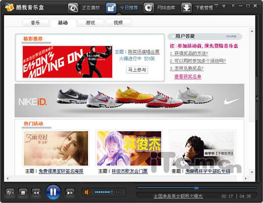 打开酷我音乐盒的“今日推荐”窗口,切换到“活动”页面,在这里你可以看到各种最新的有奖小活动,比如你想获得陈亦迅演唱会门票,只要点击“马上参与”按钮即可打开该活动的主页,活动参与很简单,只要连续播放指定的陈亦迅歌曲达到一定次数即可参与抽奖,奖品就是陈亦迅演唱会的门票。你只要每天打开酷我音乐盒,登录自己的酷我账号后,将这些指定歌曲添加到播放列表中,设置为循环播放就可以了。这样平时听听歌什么都不用管说不定大奖就会从天而降,很有意思吧。