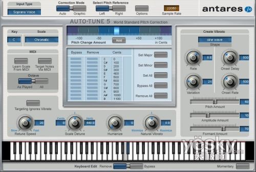 这个华丽的效果器自带一套标准钢琴键盘,单击“预览”按钮播放选择的音频,这时Auto-Tune会自动查找音高并且在键盘位置显示出来。这时在下方“Keyboard Edit”处选择的是“Remove”。也就是说,我们在键盘上点击某个按键,这个按键所对应音高的音就不会发音,而被调整到附近的某个音,但具体是调整为升调还是降调,则看该音更偏向哪个音。