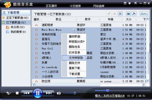 小周把喜欢的歌曲全部下载回来后,下一步就是把歌曲拷贝到手机和MP3里。按照以前的方法是打开歌曲保存目录,然后复制歌曲到手机和MP3里,非常麻烦。酷我音乐盒就简单多了,只要打开“下载管理”窗口,选中要拷贝的歌曲后,用右键单击歌曲选择“移动目录”选项,将路径指定到手机或MP3里,点击“确定”按钮即可将这些歌曲一次性拷贝到手机和MP3里了,很方便吧。