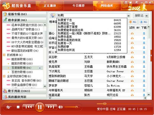如果你只记得部分歌名,不用担心,只要打开酷我音乐盒的“网络曲库”窗口,在搜索框中输入部分歌曲名,酷我音乐盒会弹出下拉菜单,自动为你推荐相关的完整歌曲名。这些歌曲名都包含你输入的歌曲名,这样从中就可以帮助你快速回忆和检索出正确的歌曲名来。只要单击正确的歌曲名就会自动完成搜索,直接将搜索结果显示显示出来,单击“试听”按钮即可快速播放歌曲,这样是不是自己需要的歌曲一听就知道了。如果你不记得歌曲名,但记得歌手名或专辑名,也可以直接输入歌手名和专辑名进行,酷我音乐盒强大的音乐曲库和详细的歌曲分类会帮助你快速检索到需要的歌曲来。比如你在某个电影或某个电视剧中听到了好听的歌曲,只要输入电影或电视剧名称即可直接搜索出相关的原声音乐曲目,很方便。