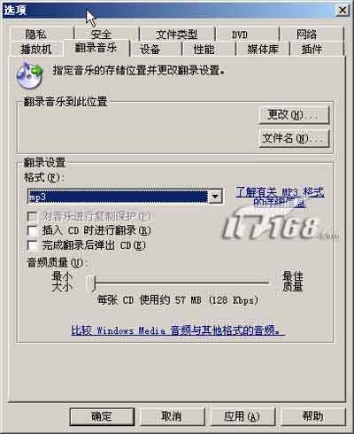 翻录之前大家首先需要在Media Player的选项设置中对MP3的质量和输出参数进行一翻设置。包括输出目录、翻录格式(包括Windows Media和MP3,Windows Media还包括了无损翻录方式)、自动翻录,以及音频质量。当然你想获得更好的音质,那只有占用更多的硬盘空间了。