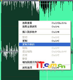 ),在听音乐的时候我们需要看着音轨1中的旋律,并大概的记清楚主旋律开始至结束的位置。找到主旋律之后,我们可以在主旋律开始的地方用鼠标点一下,这时会出现一个黄色的曲线,如果音乐位置不对,可以用键盘上功能键区的左右键进行调整。调整完毕之后,把在音轨中黄色的曲线放置主旋律音乐开始处,按住Shift键,同时按住左右调整键进行音乐主旋律的选择,选择完毕后,可以点击左下角的播放键进行选取部分的视听,合适之后在涂黑区域点击鼠标右键,选择“复制为新的”(如图3)。