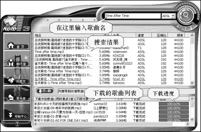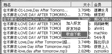 在Kuro中找到CD曲目信息后,搜索工作就非常简单了:点击任意一首曲目,Kuro就会自动搜索并提交结果。搜索结果中,每条曲目信息除了歌名,还包括文件大小、传输速度和压缩比等参考信息。为了让刻录出来的CD音质尽可能地高,建议选择文件大小相对较大、压缩比较高的文件下载。在搜索结果上点击右键并选择“歌曲下载”,该曲目就会被添加到下载列表中,并自动开始下载(如图4)。