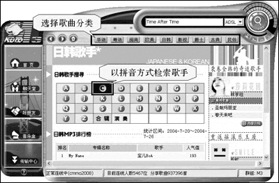 第二步 点击主界面左侧的“首页”按钮,然后从右侧的歌曲类型中选择“日韩”,就会看到一个“日韩歌手搜寻”的列表,利用它可以轻松检索到几乎每一位歌手。我们在这里点击“C”,然后进一步找到并点击艺人名“仓木麻衣”(如图2)。
