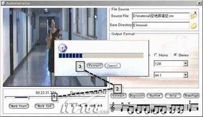 一键进行音频提取。完成视频片断的选取后,点击软件主界面右下方的“Extract”按钮,随后弹出显示音频抓取的进度条。在音频抓取的过程中,视频播放画面可能会偶尔停顿,待音频抓取的进度完成后,打开保存在目标文件夹里MP3文件,听听看,是不是电影中的原声再现啊?!