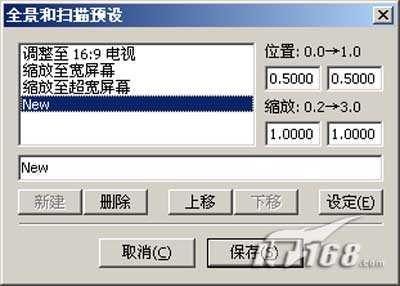 有时候我们会一边看电影一边用电脑干点别的事情,而做不同的事情需要设置视频画面不同的显示大小。其实我们可以将这些大小设置方案保存起来,方便随时切换。选择“查看→全景→编辑”菜单,单击“新建”按钮,并在“位置”和“缩放”栏设置大小参数,其中“位置”栏的数字设置在0.0-1.0之间,“缩小”栏的数字设置在0.2-3.0之间,并为该方案起个名字(如New),完毕后单击“保存”按钮。