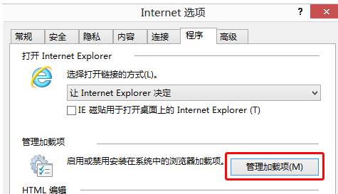 其次,系统会自动出现Internet选项窗口,操作人员在窗口中找到程序选项卡,使用鼠标点击程序选项卡,可以成功进入到程序窗口,操作人员在窗口中找到并点击管理加载项按钮。