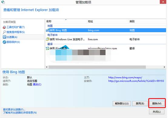 再次,系统会自动出现管理加载项窗口,操作人员在窗口中找到不需要的扩展程序或加速器,使用鼠标选中不需要的扩展程序或加速器,选中之后点击窗口右下角的删除按钮,可以将没有用的加载程序完全删除掉。