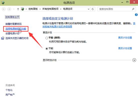 2.在打开的电源选项窗口中,点击打开左侧的“选择电源按钮的功能”进入下一步操作。如下图所示