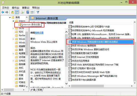 2.依次展开计算机配置->管理模板->系统->Internet通信管理,点击Internet通信管理下面的电信设置,然后右侧界面中找到“关闭Windows网络连接状态指示器活动测试”。如下图所示