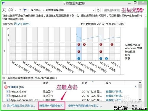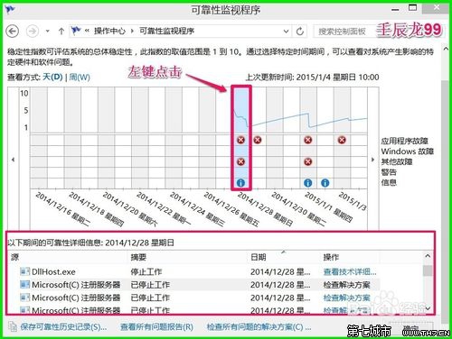 4、我们点击查看可靠性历史记录后,会出现一个可靠性监视程序窗口,如果我们要查看2014年12月28日的问题详细信息,左键点击2014年12月28日对应的小框,在下面就会显示以下期间的可靠性详细信息:2014年12月28日星期日;