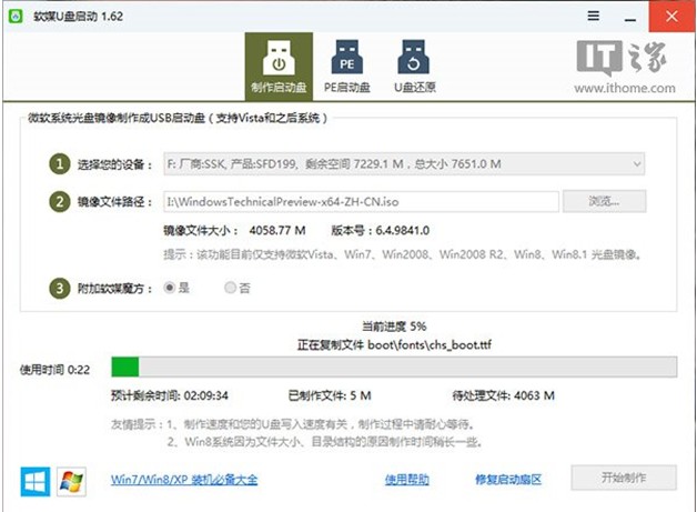 按照图中的提示,只需要选择好U盘(一定要看仔细,别选错!)和镜像后,点击“开始制作”即可。
