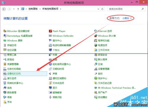 2、将查看类型更改为小图标,然后点击“设备和打印机”,如下图所示。