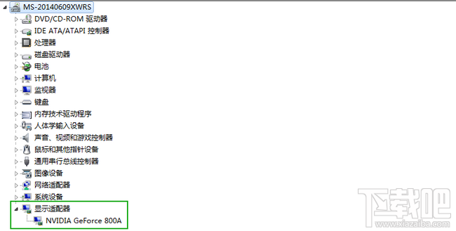 3.点击左边的“设备管理器”,展开“显示适配器”即可查看显卡配置(型号NVIDIA GeForce 800A),GPU频率、显存等信息此处是看不了的。