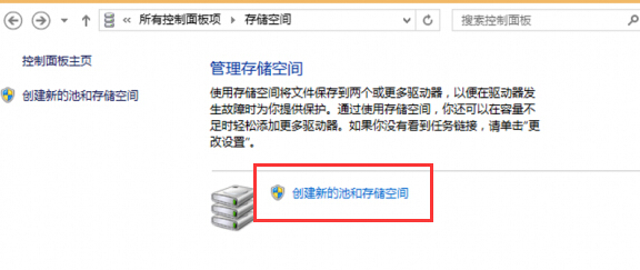 3.之后,就会出现管理存储空间的串口了,点击左侧菜单中的“创建新的池和存储空间”。