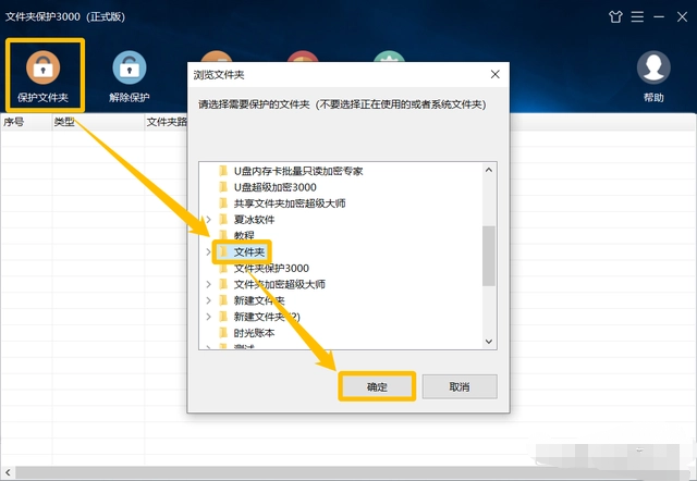 1.首先我们在电脑上打开文件夹保护3000,点击“保护文件夹”,在弹窗中选择需要保护的文件夹,点击“确定”,