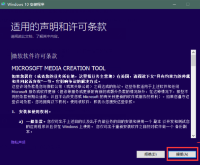 1、下载工具下载MediaCreationTool,下载后,点击“以管理员身份运行”,然后点击“接受”,选择“立即升级这台电脑”,点击下一步接口