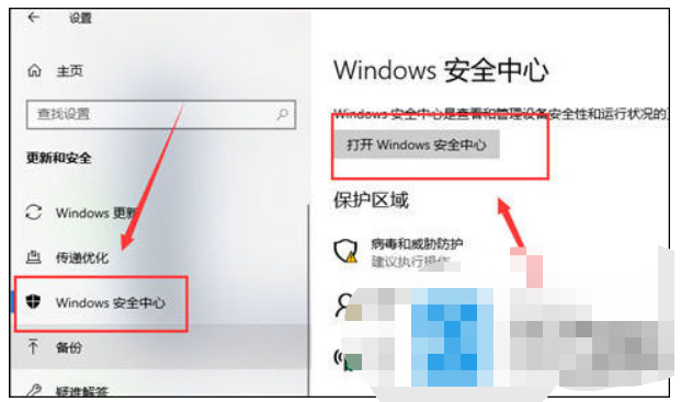 3、在左侧列表中选择Windows 安全中心,在右侧选择打开Windows 安全中心。