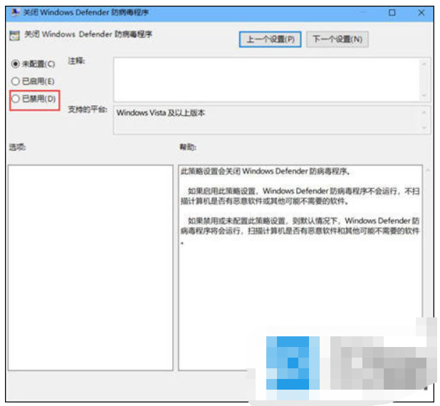 3、在右侧选择关闭Windows defender防病毒程序,打开选择启用,确定!
