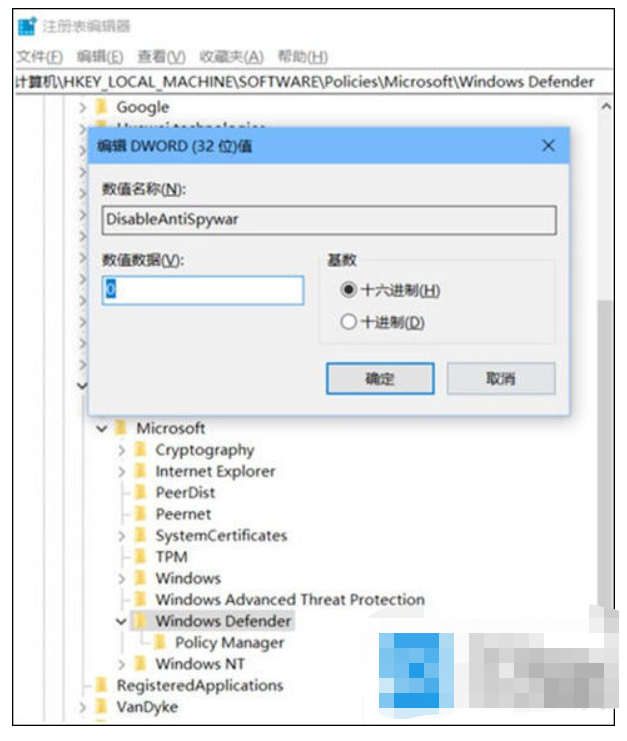 3、然后鼠标右键右侧界面,选择新建,DWORD(32位)值,将其命名为DisableAntiSpyware,数值修改为1,最后点击确定即可。