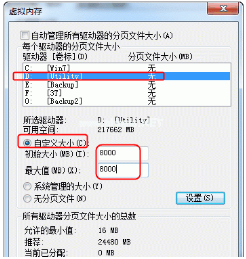3、选择虚拟内存所在的驱动器。建议选择c驱动器以外的驱动器,然后单击自定义大小以开始设 置。
