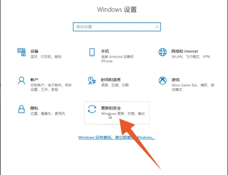 2、打开Windows设置页面后,选择并点击【更新和安全】选项。