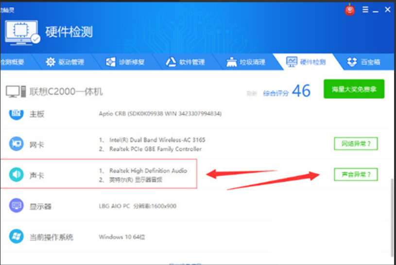 4.该软件可不仅仅只有检测声卡驱动是否安装这一个功能,它还能进行当前电脑的硬件检测,用户只需点击硬件检测选项。