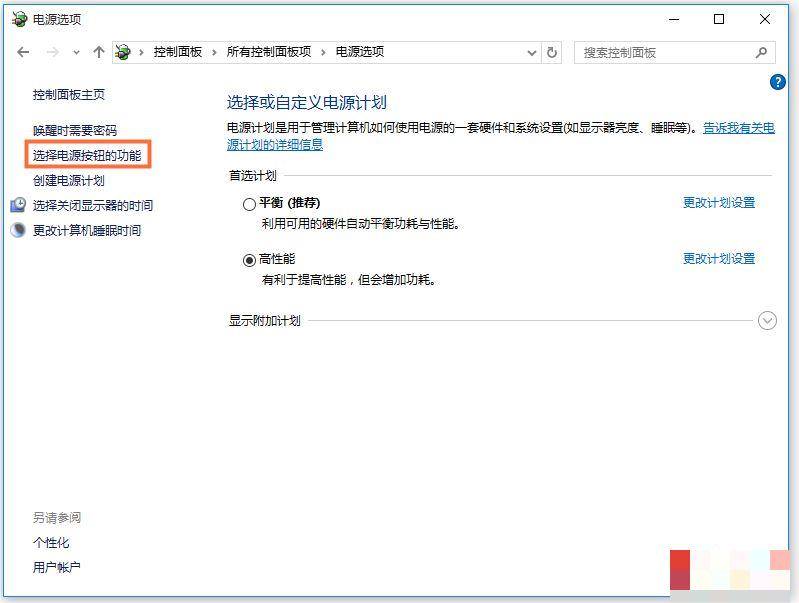 3.打开“电源选项”并找到“更改电源按钮的功能”以打开,进入下一步。