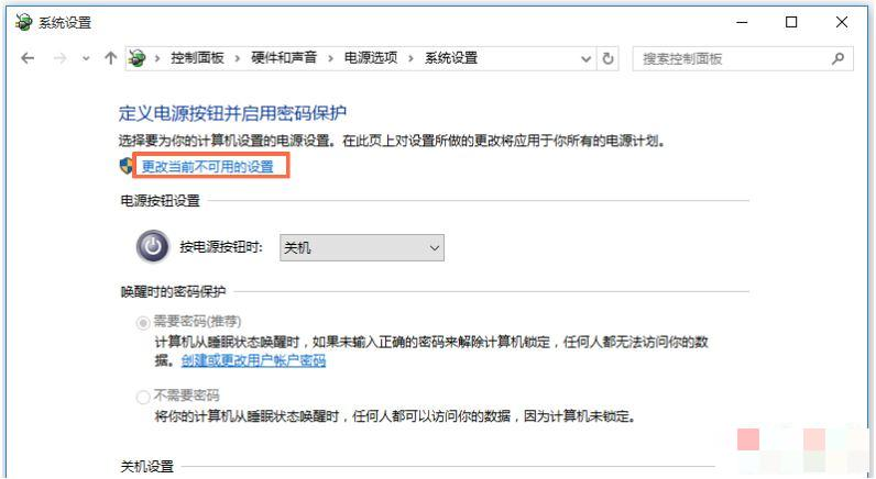 4、然后进入系统设置界面,先点击【更改当前不可用的设置】,然后勾选【启用快速启动】,点击保存修改即可。
