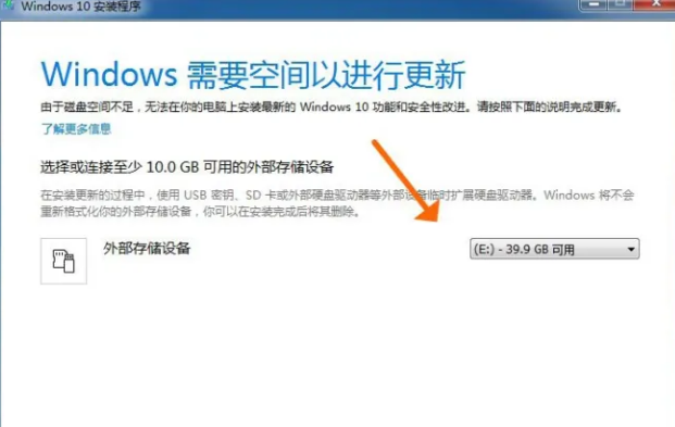 7、Win7升级Win10至少需要10GB的外部存储空间,在外部存储设备中选择保存的位置。