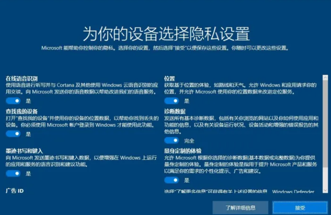 11、然后进入到「为你的设备选择隐私设置」,这里根据自己的情况选择吧,选择完毕后按「接受」按钮。
