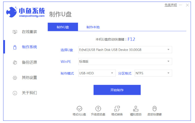 1、首先在一台可联网使用的电脑上安装好小鱼一键重装系统工具打开,插入空白u盘,选择u盘重装系统模式,点击开始制作启动盘,链接入口:http://www.xiaoyuxitong.com/。