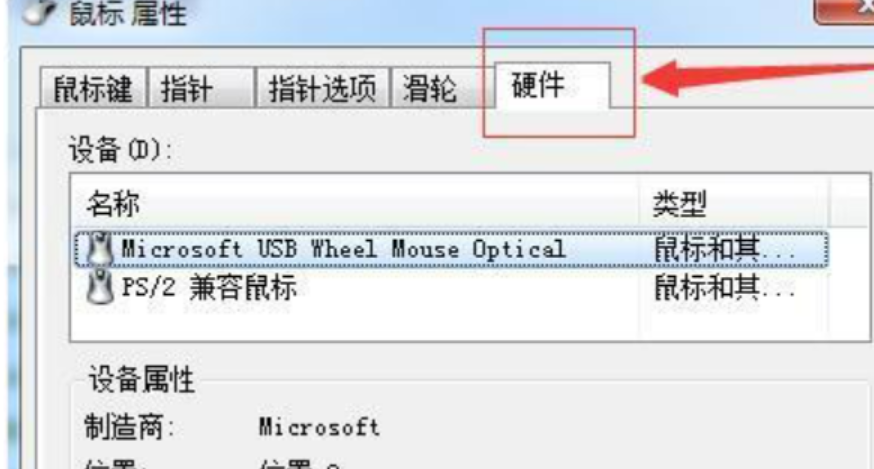 3、切换到【硬件】的菜单选项,弹出对应鼠标属性界面。
