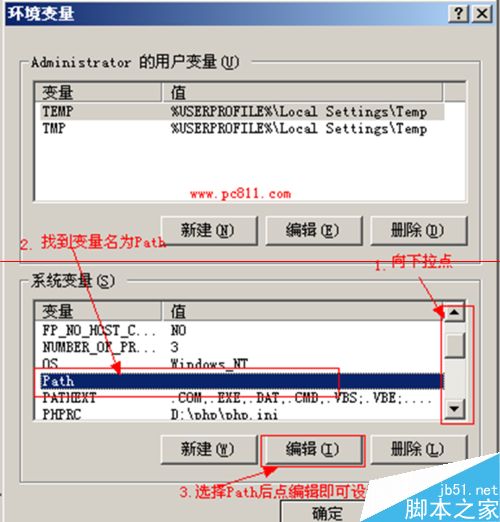 3、在弹出的环境变量窗口中,拉动下拉框,找到并单击选择Path变量名,然后点编辑(N)按扭进行设置。